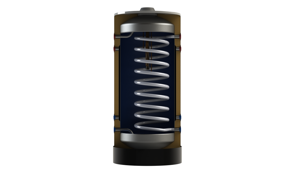 Réservoir de stockage de chaleur avec un échangeur de chaleur, revêtu intérieurement d'émail pour plus de durabilité, adapté à une utilisation intérieure ou extérieure et au raccordement à des capteurs solaires ou à une pompe à chaleur.