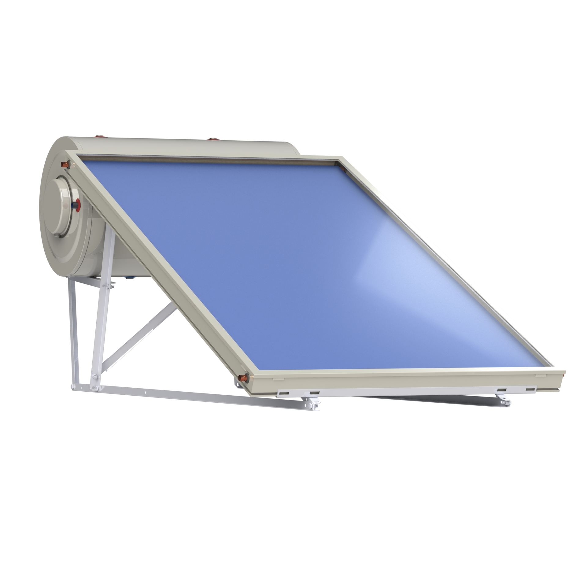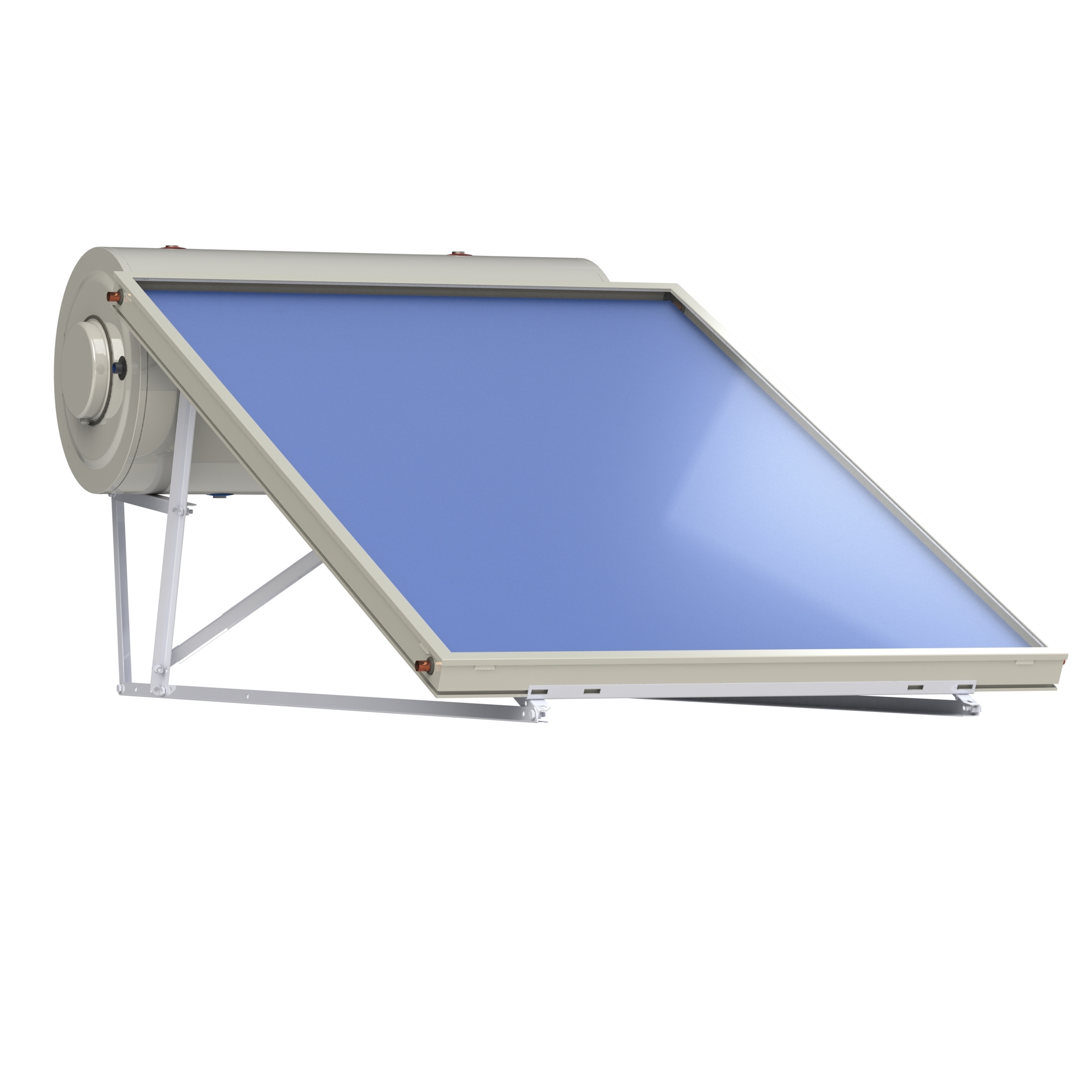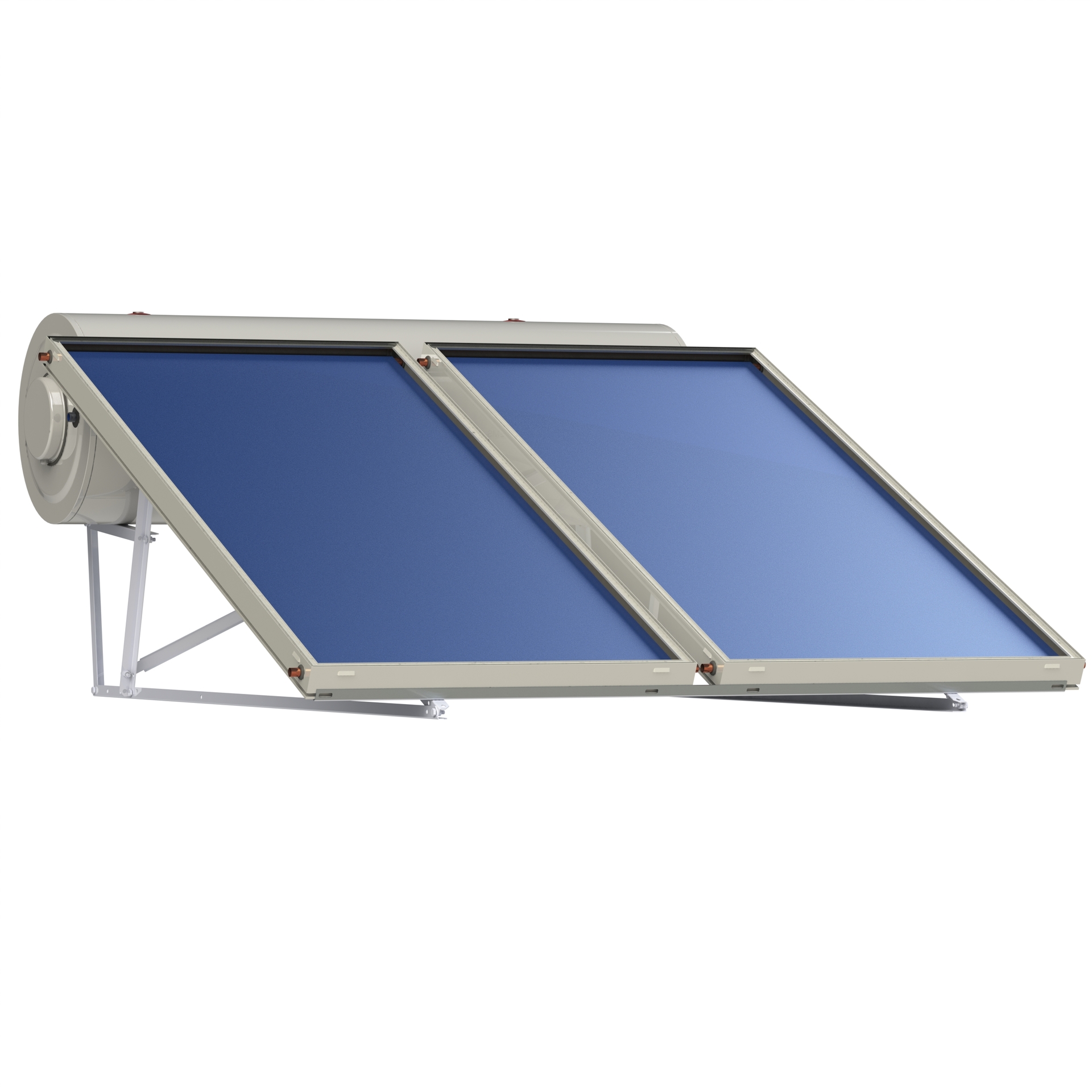 Chauffe-eau solaire compact avec ballon à circuit fermé de 300 litres et capteur sélectif de 5,04 m², adapté à 7-8 utilisateurs. Disponible avec une embase inclinée à 25° et un raccordement pour pompe à chaleur.