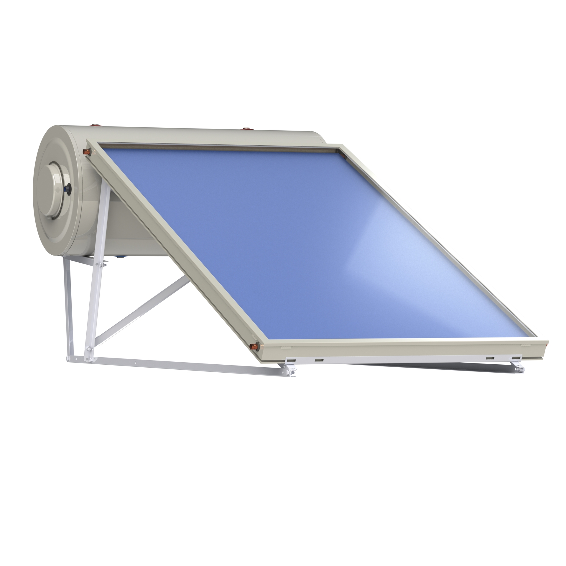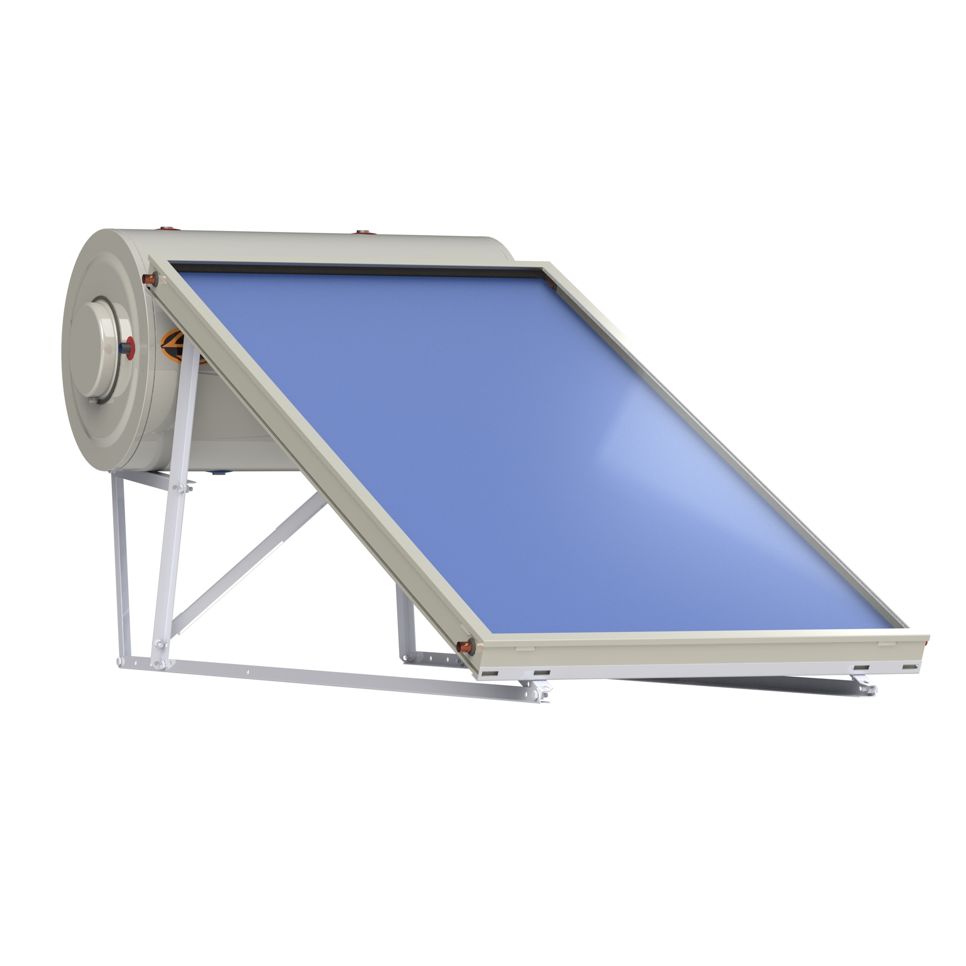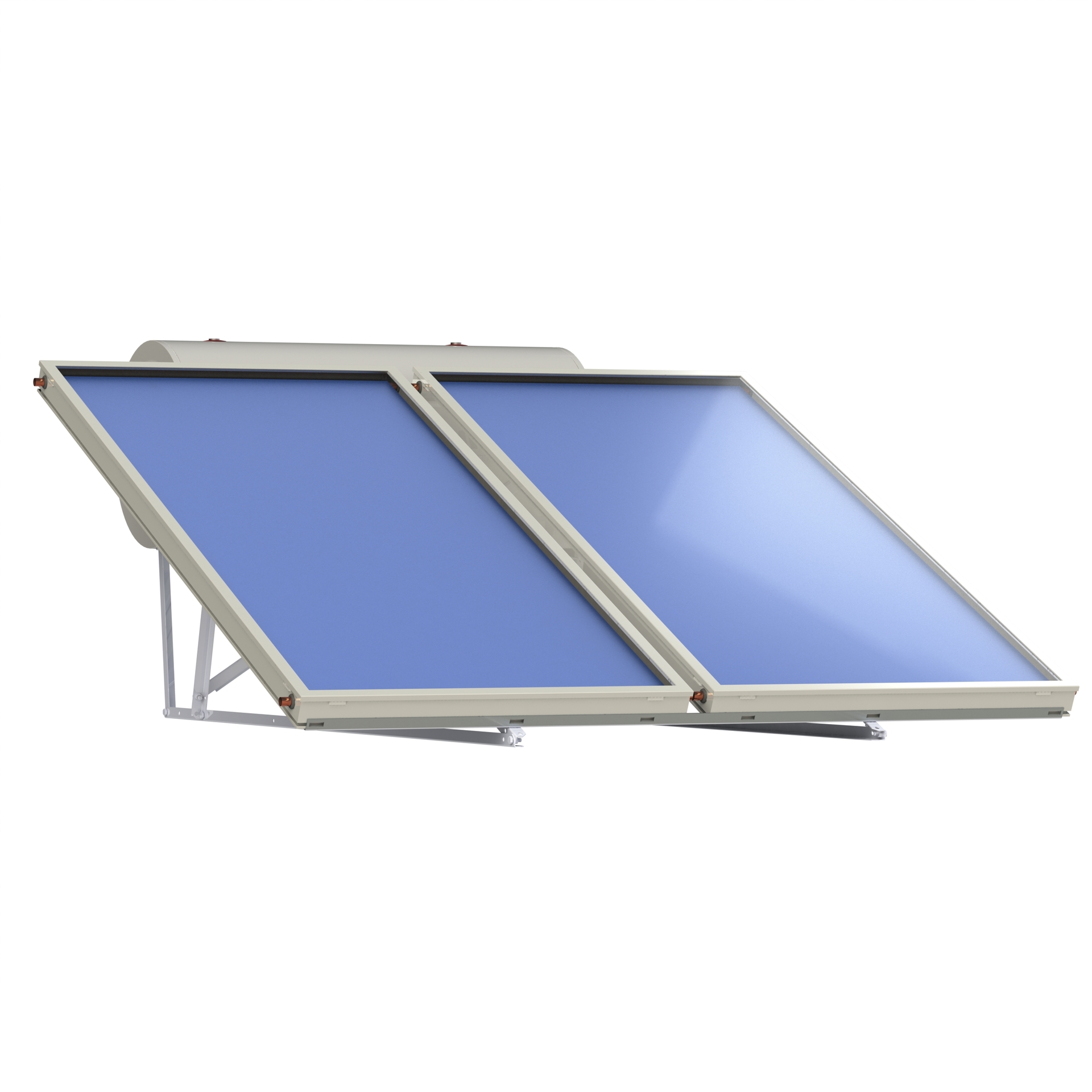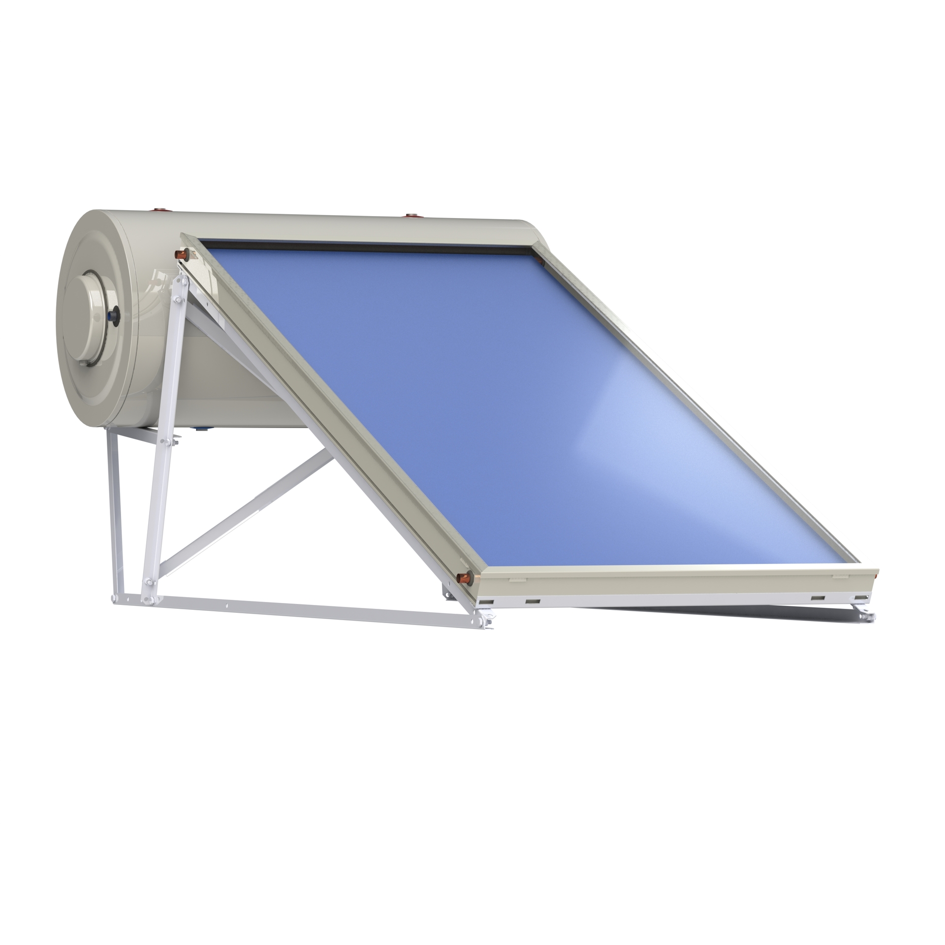 Chauffe-eau solaire compact avec ballon à circuit fermé de 300 litres et capteur sélectif de 5,04 m², adapté à 7-8 utilisateurs. Disponible avec une embase inclinée à 25° et un raccordement pour pompe à chaleur.